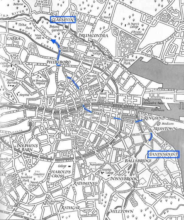 Altıncı bölümün başında cenaze konvoyumuz Sandymouth’daki cenaze evinden hareket ediyor. Bizim arabamızda dört kişi var. Martin Cunningham, Jack Power, Simon Dedalus (Stephen’ın babası) ve tabii ki Leopold Bloom. Nasıl bir önceki bölümde Bloom’la beraber Dublin’i gezmeye başlamışsak, ölüye son saygıyı gösterme amaçlı bu yolculukta da mezarlığa kadar olan güzergahı tanıyoruz biraz. Herhalde kitap bitene kadar Dublin’in yerlisi gibi olacağız.