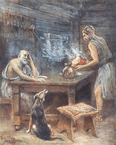 Evet, Ithaka’ya dönüyor Odysseus nihayet Nausikaa’nın adasından sonra tek başına. Ama evinin bıraktığı gibi olmadığını Athena’dan öğreniyor önce. Evi taliplilerce kuşatılmış, oğlu kendinden haber almak için yola çıkmış. O da Athena’nın yardımı ile yaşlı bir adam kılığına girip, yine onun tavsiyesiyle kendine halen sadık olduğunu düşündüğü domuz çobanı Eumaios’un barınağına gidiyor. Eumaios Odysseius’u tanımıyor ama onu ağırlayıp, nazik ve dürüstçe davranıyor. Bu  arada Telemakhos da eve dönüş yolunda kendisine kurulan pusudan kurtuluyor ve kulübeye geliyor. Onu sınayan Odysseus, oğulluk görevlerini yerine getirmiş olduğunu görünce kimliğini açıklıyor, sonra da bu üçlü evi ve penelope’u kurtarmak üzere bir plan yapıyorlar.