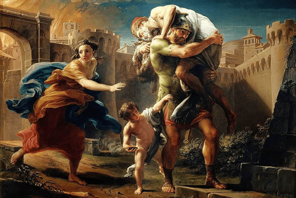 Artık ailesinin yanına dönüp Hektor’un vasiyetini yerine getirmesi lazım kahramanımızın. Ama ailesini daha doğrusu babası Anchises’i ikna etmesi zor oluyor epey. Kalıp Truva ile birlikte ölmek istiyor yaşlı adam. Aeneas çaresizce yalvarıyor adama, sonra yanında kalmak istiyor ama karısı Creusa kendinin ölebileceğini, ama oğlunu koruması gerektiğini söylüyor Aeneas’a. Kararsız Aeneas’a bu kez tanrılar yardım ediyor. Önce oğlu Ascanius’un saçındaki bir alev babasını şüpheye sürüklüyor, tanrılardan bir uyarı daha istediğindeyse kayan bir yıldızla yanıt veriyor Jüpiter yaşlı adama. Böylece babasını sırtına alıp oğlunun elini tutan iyi baba/iyi oğul Aeneas şehrin dışına kadar çıkarıyor onları.