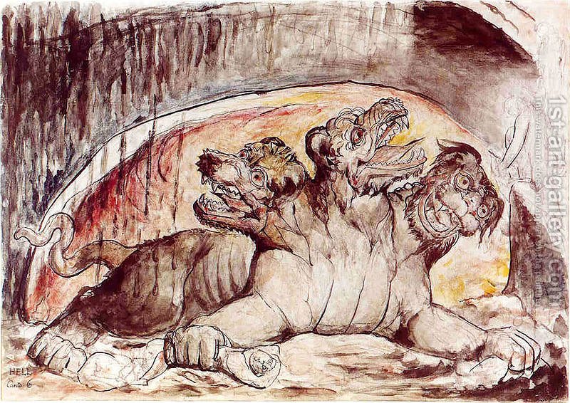 Kerberos (Cerberus) var sonra, doymak bilmeyen iştahıyla burası için iyi bir bekçi. Tabii Harry Potter dedim ama Yunan ve Roma mitolojisinde bolca görüyoruz kendisini en başta Herkülün görevlerinde sonra da Aeneis’de . Ama buradan farklı olarak Aeneas’ın rehberi Sybil köpeği susturmak (uyutmak ) için ballı ekmekle otlar veriyordu ağzına. Burada ise oburların gardiyanını yine çamur ve pislik vererek susturuyor Vergilius. (Dante’nin küçük dokunuşları:)