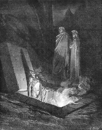 Mezardan çıkan ilk ruh Dante doğmadan bir sene önce ölen Farinata degli Uberti. Kendisi İmparatorluk yanlısı Ghibellini’lerin lideri. Dante’nin sözlerinden cehennemden korkmayan asil bir insan olduğu anlaşılıyor. Konuşma esnasında geçmişte olan şeyleri iki karşıt grup mensubunun konuşmalarından öğreniyoruz. Cavalcante’den sonraki kısa aradan sonra da Dante’nin geleceği hakkında konuşuyor Farinata. Mezardaki diğer ruhu önemsememesi , onun da karşıt gruptan olmasına ya da Floransa dışında başka bir şeyle ilgilenmemesine bağlayabiliriz galiba. Zaten Şair Dante’nin bu düşmanını onore etmesi biraz da bu Floransa sevgisinden kaynaklanıyor. (Burası için “Ruhlar kendilerine o kadar kapılmışlar ki diğerlerini fark etmiyorlar bile” yorumları da var.)